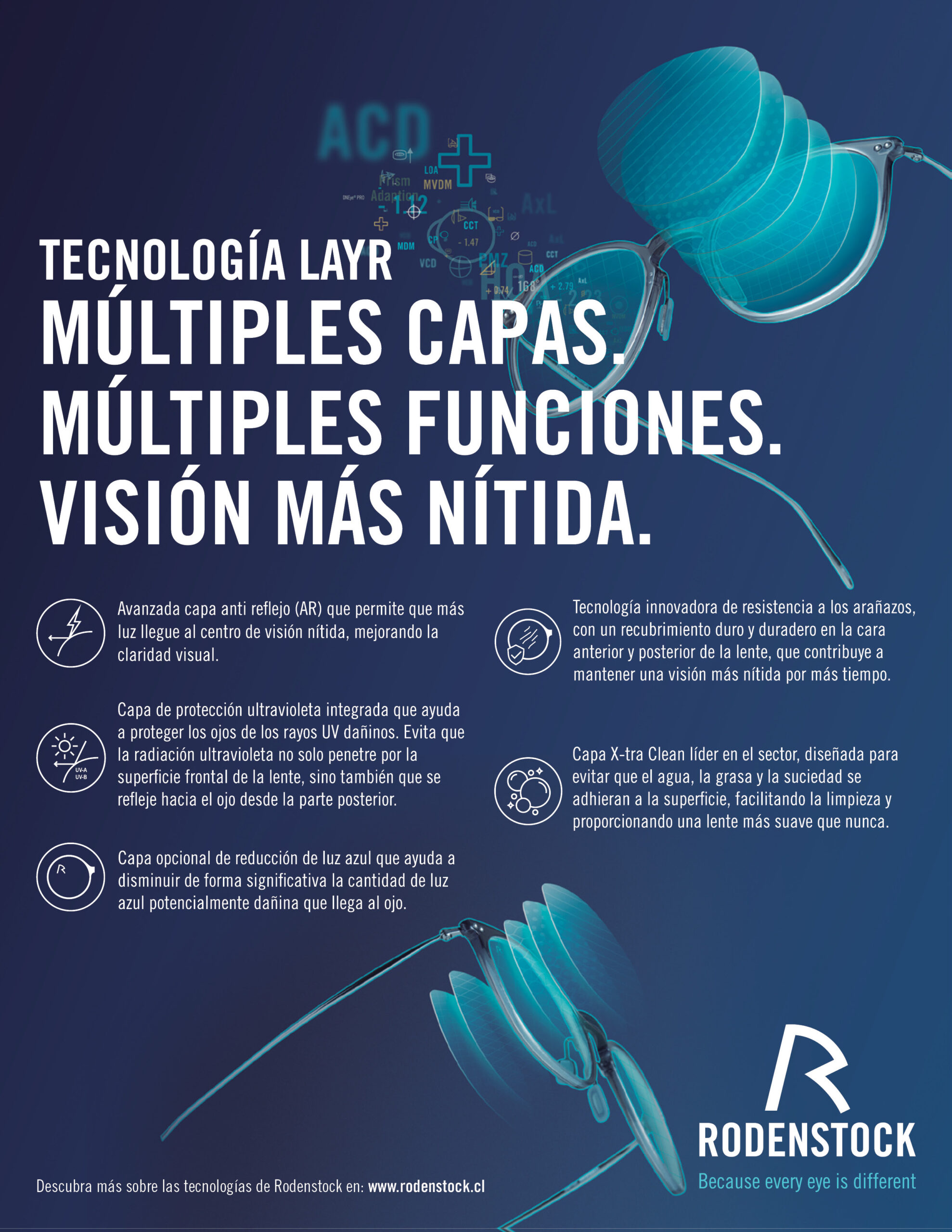 Con LayR, Rodenstock aborda cada uno de estos desafíos capa por capa, combinando el poder de sus Lentes Biométricos Inteligentes con un sistema de recubrimientos de alto desempeño que ofrece una experiencia visual superior en cualquier situación.