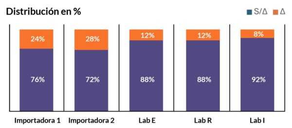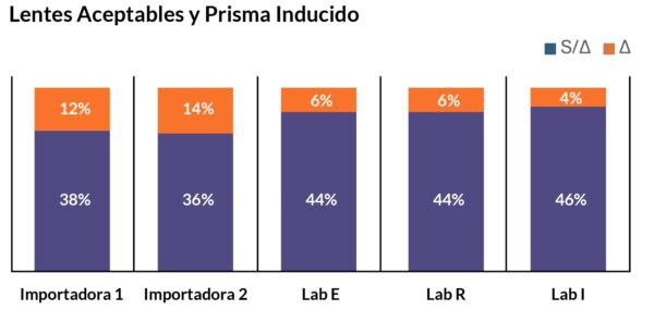 El gráfico de la figura 1, muestra los resultados de las 5 empresas y sus valores tanto porcentuales como en cantidad de lentes analizadas. En él destaca la cantidad de lentes aceptables(azul) y la cantidad con prismas inducidos (naranjo).
