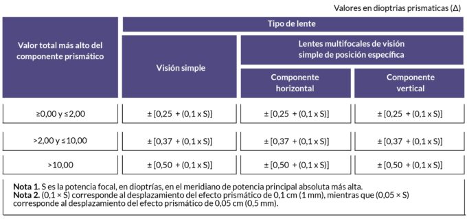 Tabla 1. Tolerancias del desequilibrio prismático (error prismático relativo) para lentes monofocales y lentes multifocales. Norma ABTN-ISO 8980. https://www.scribd.com/presentation/588442232/Abnt-Iso-8980-Parte-1