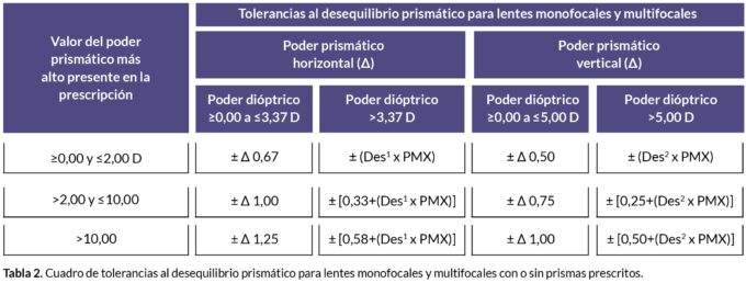 En la tabla 1, se muestran las tolerancias al desequilibrio prismático tanto para monofocales como para multifocales (bifocales) con o sin prismas prescritos. Esta norma brasileña es similar a la norma UNE-ISO 8980-1. Estas son bastantes similares a la norma UNE-EN ISO 21987, (Tabla 3), que será una de las normas que se analizará a continuación.