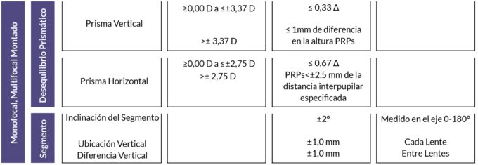 Tabla 3. Muestra la tolerancia de desequilibrio prismático y posición del segmento de una lente multifocal.